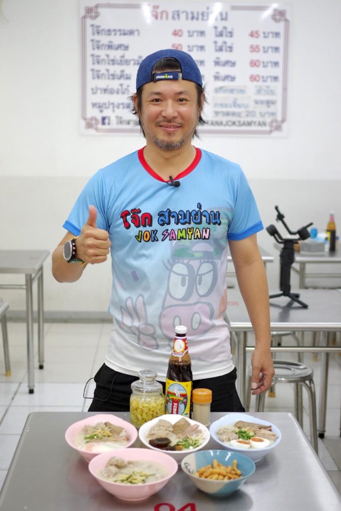 ขณะที่ทีมงานจัดแจงเครื่องมืออุปกรณ์เพื่อถ่ายทำคลิปสั้นๆ ถึงเรื่องราวของเขา โจ้ยังพอมีเวลาที่จะบอกเล่าความเป็นมาของการมารับช่วงต่อเป็นพ่อค้าขายโจ๊ก เสียงเนิบๆ มีระนาบเดียว เอ่ยว่า แรกเริ่มบรรพบุรุษ คือ อากงอพยพมาจากเมืองจีนเช่นคนจีนโพ้นทะเลอื่นๆ ที่เดินทางมาแสวงโชคในเมืองไทย พอมาถึงกรุงเทพฯ ก็ตั้งรกรากลงหลักปักฐานที่อยู่ปัจจุบันนี้เลยก็คือ สามย่าน หลายสิบปีต่อมาจึงกลายเป็นจามจุรีสแควร์ และมาเป็นจุฬาฯซอย 11 ในปัจจุบัน
