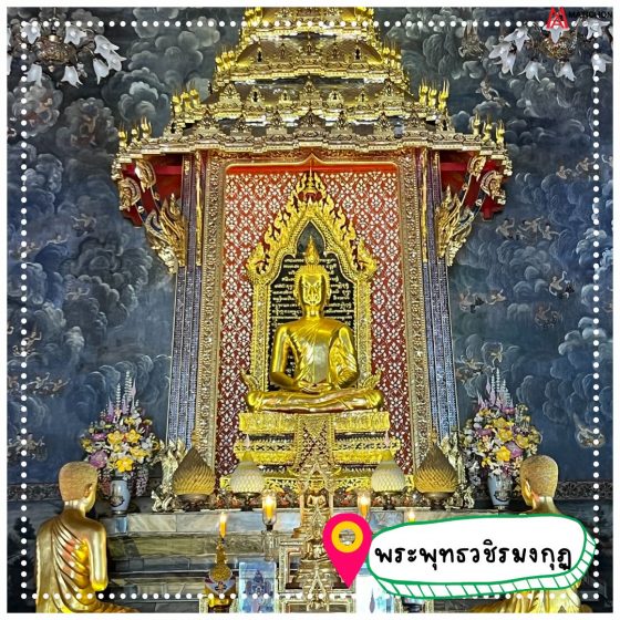 “พระพุทธวชิรมงกุฏ” พระประธานหล่อสำริด ปางสมาธิ ศิลปะรัตนโกสินทร์ มีริ้วจีวรเป็นริ้วผ้าตามธรรมชาติ ไม่มีพระเกตุมาลา ตามแนวคิดสัจนิยมอันได้รับอิทธิพลจากตะวันตก