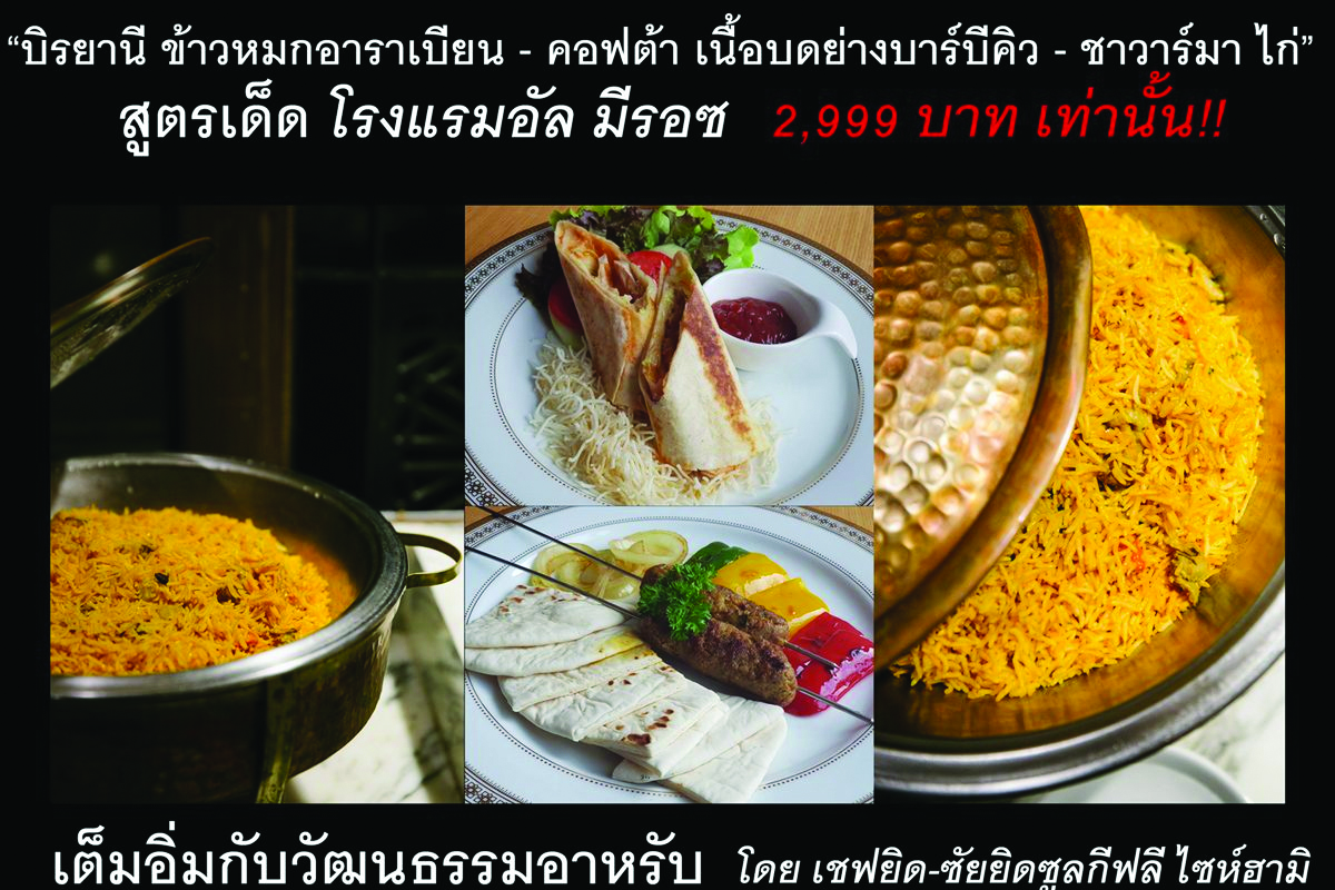 “มติชน อคาเดมี” ไม่รอช้าจับมือกับ “อัล มีรอซ” โรงแรมฮาลาลระดับ 4 ดาว ซึ่งเป็นโรงแรมที่ได้รับความไว้วางใจจากผู้เข้าพัก โดยเฉพาะชาวมุสลิม ทั้งด้านบริการ และ อาหาร คว้าตัวเชฟหนุ่มวัย 29 ปี “ซัยยิดซูลกีฟลี ไซห์ฮามิ“ หรือ เชฟยิด ผู้ช่วยเชฟจากห้องอาหารดีวาน ห้องอาหารนานาชาติ มาสอนหลักสูตรอาหารอาหรับถึง 3 รายการ ได้แก่ บิรยานี ข้าวหมกไก่อาราเบียน คอฟต้า หรือ เนื้อวัวบดผสมเนื้อแกะบดย่างบาร์บีคิว และ ชาวาร์มา อาหารยอดฮิตของชาวอาหรับ