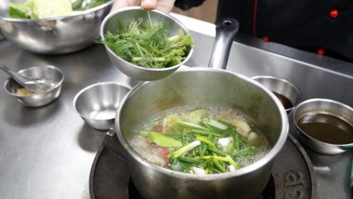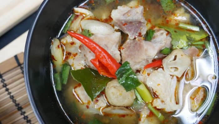 “เมนูต้มเราจะต้มซุปไว้ก่อน ที่จะสอนคือกระดูกอ่อน เบสนี้เราเอามาทำเล้งแซ่บก็ได้ ซุปเปอร์ตีนไก่ก็ได้ นอกจากจะประหยัดเวลายังคงรสชาติให้มาตรฐานเดียวกันทุกชามอีกด้วย อย่างต้มแซ่บกระดูกอ่อน เบสจะมีข่า ตะไคร้ ใบมะกรูด พริกป่น พริกผัด ถ้าจะทำต้มยำ ก็แค่ดึงพริกป่น และข้าวคั่วออกไป ก็เป็นต้มยำน้ำใส ถ้าน้ำข้นก็เพิ่มนมสด”