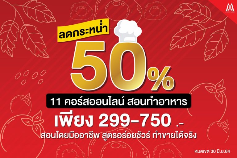 ลดกระหน่ำ 50% ช่วยเหลือผู้ได้รับผลกระทบจากวิกฤตโควิด 11คอร์สออนไลน์สอนทำอาหาร ราคาถูกสุดๆ เพียง 299-750 บาท!! สอนโดยมืออาชีพ สูตรอร่อยชัวร์ ทำขายได้จริง ผู้เรียนหลายคนเปิดร้านแล้ว