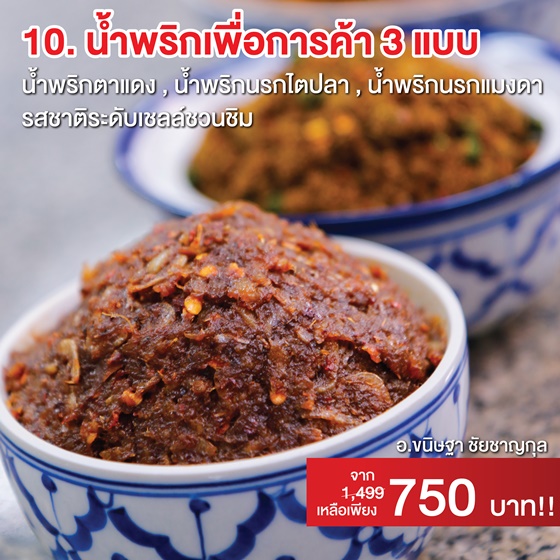 10. น้ำพริกเพื่อการค้า 3 แบบ รสชาติระดับเชลล์ชวนชิม น้ำพริกตาแดง , น้ำพริกนรกไตปลา , น้ำพริกนรกแมงดา สอนโดย อ.ขนิษฐา ชัยชาญกุล จาก 1,499 บาท เหลือเพียง 750 บาท