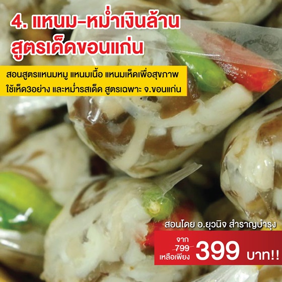 4. แหนม-หม่ำเงินล้าน สูตรเด็ด จ.ขอนแก่น สอนสูตรแหนมหมู แหนมเนื้อ แหนมเห็ดเพื่อสุขภาพ ใช้เห็ด3อย่าง และหม่ำรสเด็ด สูตรเฉพาะ จ.ขอนแก่น สอนโดย อ.ยุวนิจ สำราญบำรุง จาก 799 บาท เหลือเพียง 399 บาท