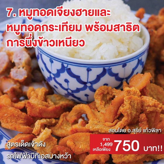 7. หมูทอดเจียงฮายและหมูทอดกระเทียม พร้อมสาธิตการนึ่งข้าวเหนียว สูตรเด็ดเจ้าดังรถไฟฟ้าบีทีเอสบางหว้า สอนโดย อ.สุรีย์ แก้วพิลา จาก 1,499 บาท เหลือเพียง 750 บาท