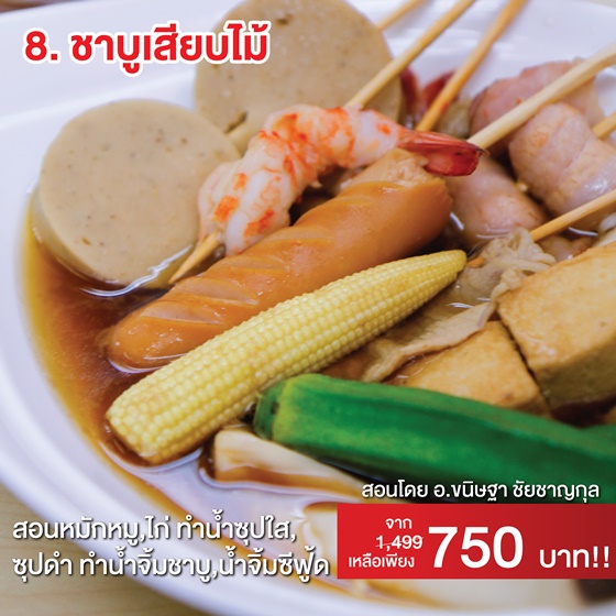 8. ชาบูเสียบไม้ สอนโดย อ.ขนิษฐา ชัยชาญกุล สอนหมักหมู,ไก่ ทำน้ำซุปใส,ซุปดำ ทำน้ำจิ้มชาบู,น้ำจิ้มซีฟู้ด จาก 1,499 บาท เหลือเพียง 750 บาท
