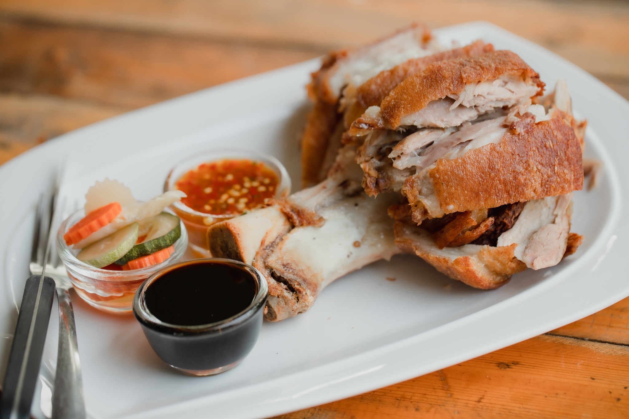 วันนี้เรามีทางเลือกให้คุณอร่อยได้ง่ายๆ สำหรับผู้หลงใหลในความกรอบนอกนุ่มในของขาหมูเยอรมัน ร้านนี้ติด 1 ใน 5 ร้านดังขาหมูเยอรมันที่ต้องตำให้ได้ การันตีว่าไม่ทำให้คุณผิดหวังแน่นอน สัมผัสถึงเท็กซ์เจอร์ได้ตั้งแต่กัดคำแรก หนังกรอบกร๊วบจนแอบกินในห้องเรียนไม่ได้ ไม่แข็ง ไม่เหนียว ตามมาติดๆด้วยเนื้อของขาหน้าแสนนุ่ม ทานคู่กับน้ำจิ้มเข้ากันแบบเด็ดสุดๆ แกล้มด้วยผักดอกหวานกรอบ