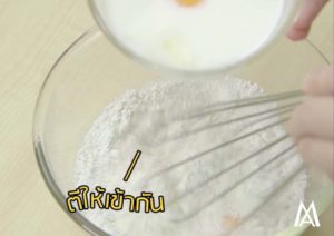 – ต่อมานำนม ไข่ไก่ คนให้เข้ากันแล้วนำไปผสมกับแป้งที่เราผสมกับนำ้ตาลไว้ คนส่วนผสมให้เข้ากันดี แล้วนำไปกรองให้เนื้อแป้งละเอียดเนียน