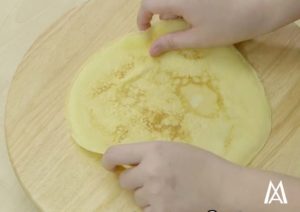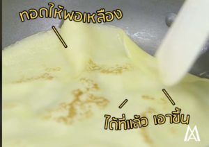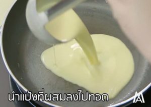 – หากระทะตั้งไฟอ่อน นำแป้งที่ผสมแล้วลงไปทอด(แป้งต้องทอดบางๆ)