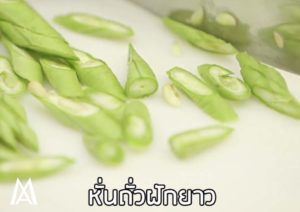 1. นำถั่วฝักยาวมาหั่น, ซอยกระเทียม, ซอยหอมหัวใหญ่ เตรียมไว้รอผัด