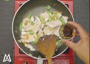 5. นำเนื้อไก่ที่หั่นไว้มาผัดแล้วใส่ถั่วฝักยาว, ใส่ไข่เค็ม, น้ำพริกเผา, ซีอิ๊วขาว, น้ำตาลทราย, พริกไทยป่น, ซอสปรุงรส ลงไปแล้วผัดให้เข้ากันดี