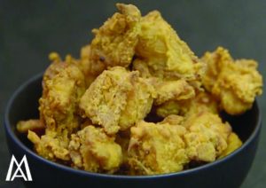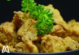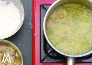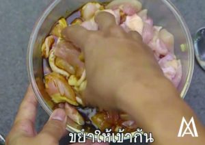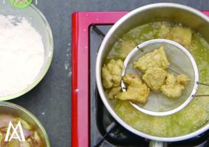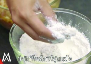 4. นำกระทะตั้งน้ำมันให้ร้อน นำไก่ที่หมักไว้มาชุปแป้ง แล้วนำลงทอดให้เหลืองกรอบ
