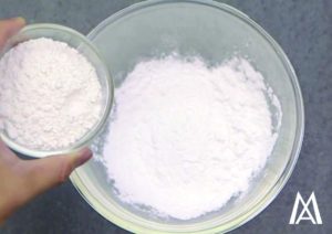 1. นำแป้งมัน, แป้งอเนกประสงค์ ผสมแป้ง 2 ชนิดให้เข้ากัน