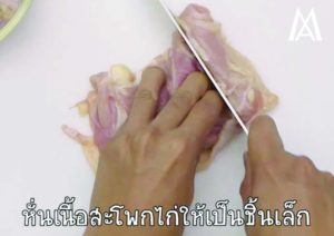 2. ต่อมานำเนื้อสะโพกไก่มาหั่นเป็นชิ้นเล็กเตรียมไว้
