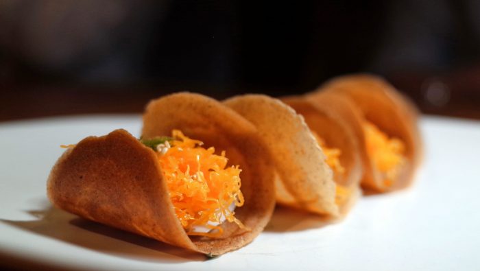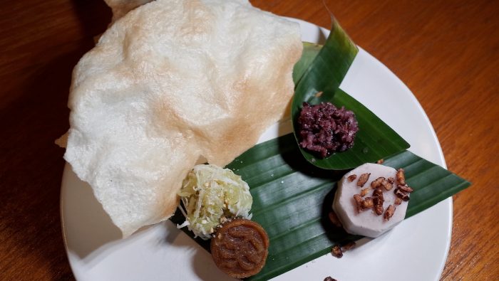 คำแรกของมื้อเริ่มด้วย ขนมเบื้องไส้เค็ม ที่เชฟพิมเชื้อเชิญให้ชิมถึงในครัว เป็นขนมไทยโบราณธรรมดาที่ทำออกมาได้พิเศษที่สุด แป้งบางกรอบสีดำใช้ส่วนผสมจากขี้เถ้ามะพร้าว ไส้กุ้ง มะพร้าวผัดที่บางส่วนนำไปแช่กับน้ำฝางจนได้สีแดงสวย ให้ความรู้สึกย้อนระลึกไปถึงตอนวัยเด็ก