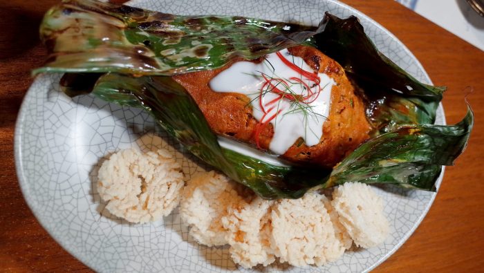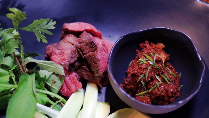 น้ำพริกไหม้ใส่มะขามป้อม กินกับเนื้อวากิวหั่นลูกเต๋าไซซ์พอดีคำที่นำไปแช่น้ำปลาไว้ก่อนเอาไปย่างเสิร์ฟแบบมีเดียม แรร์ ไม่ต้องบรรยายมากความ เนื้อนุ่มฉ่ำหวานของวากิวกินคู่กับน้ำพริกผัดที่ใช้กะปิอย่างดีมันเข้ากันมาก ส่วนชื่อน้ำพริกไหม้เชฟพิมบอกว่าเพราะต้องเอาของทุกอย่างไปเผาจนไหม้นั่นเอง