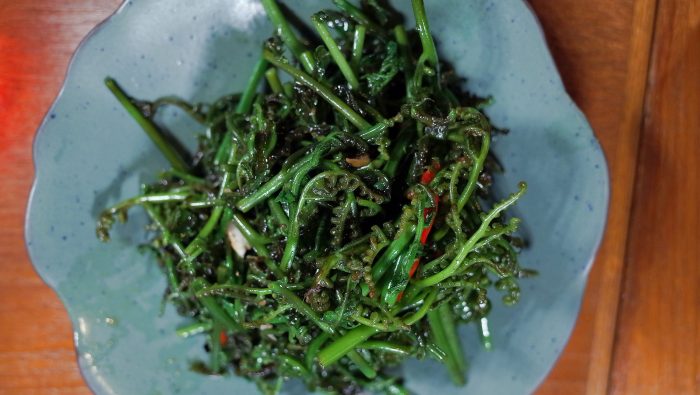 ผัดผักกูดไฟแดง เด็ดเฉพาะส่วนยอดผัดให้ผักไม่สุดมาก ยังมีความสดกรอบ เนื้อสัมผัสมียางนิดๆ รสฝาดหน่อยๆ กินกับข้าวสวยที่หุงในหม้อดินต้องบอกว่ากินได้กินดีจริงๆ
