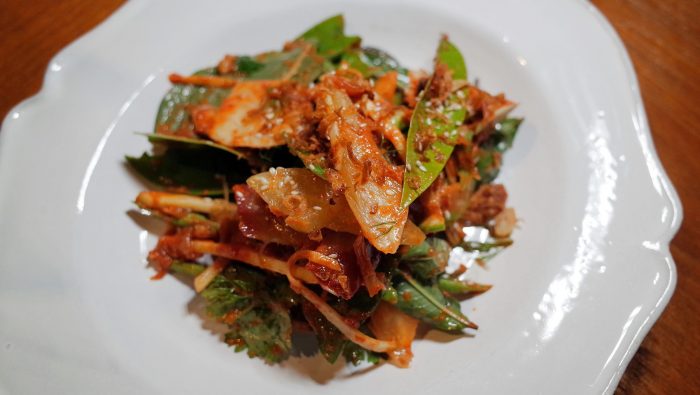 ลาบคั่วไก่ต๊อก เป็นลาบแบบเหนือ ชัดเจนด้วยรสสัมผัสและกลิ่นจากมะแขว่น เนื้อไก่ต๊อกฉีกนุ่มเหนียว มีความเผ็ดร้อนที่เชฟพิมบอกไว้ว่า ถ้าจานไหนเผ็ดก็ต้องเผ็ด ขึ้นชื่อว่าเป็นลาบคั่วไม่เผ็ดไม่อร่อย