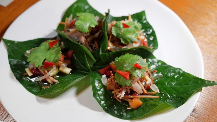 จากนั้นเริ่มเสิร์ฟออเดิร์ฟเบาๆ เป็นคำเล็กๆ จาก ปูซ่อนกลิ่น ที่นำเนื้อปูสดแกะใหม่มายำกับส่วนผสมสมุนไพรต่างๆ ให้รสชาติจี๊ดจ๊าด เปรี้ยว เค็ม หวาน เผ็ดเบาๆ และ เมี่ยงนพเก้า เรียกน้ำย่อยได้ดีจริงๆ