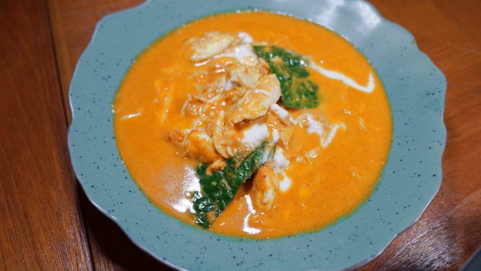 ต้มกะทิไก่ใส่มะม่วงเปรี้ยว ชามนี้รับประทานเป็นซุปกะทิรสเข้มมัน น้ำสีขาวนวลหอมเครื่องข่า ตะไคร้ ใบมะกรูด หวานจากหอมแดง บีบมะมาวให้ความหอมสดชื่น จะอร่อยมากขึ้นถ้าตักเนื้อมะม่วงขึ้นมาเคี้ยวด้วย