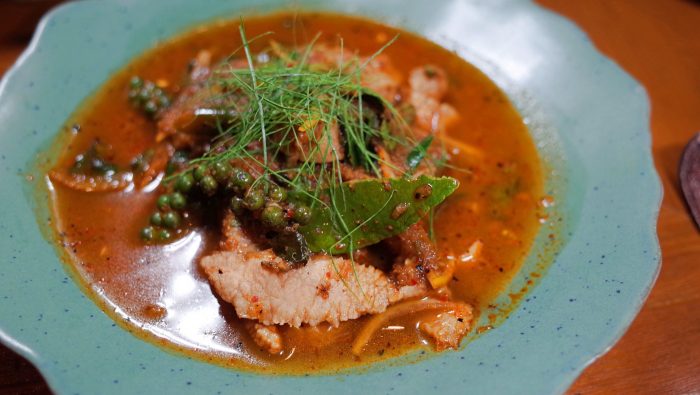 แกงป่าหมูสมุนไพรใส่ข้าวคั่ว จานนี้หอมกลิ่นเครื่องเทศยั่วน้ำย่อยมาก ทีเด็ดอยู่ที่ใช้แก้มหมูที่นุ่มหยุ่น และหายากมาทำ รสชาติจัดจ้านเผ็ดร้อนกำลังดี