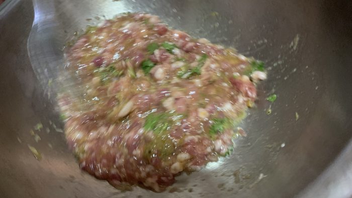 เมื่อเตรียมของเสร็จแล้ว ขั้นแรกให้นำผักชี กระเทียม และพริกไทย ใส่ในครกแล้วตำให้ละเอียดจนส่วนผสมทั้งหมดเข้ากัน เมื่อตำจนละเอียดแล้ว ตักใส่กะละมังผสม ใส่ไข่ไก่ลงไป ตามด้วยเนื้อหมู เกลือ และน้ำตาล ขยำให้ส่วนผสมและเนื้อหมูเข้ากัน