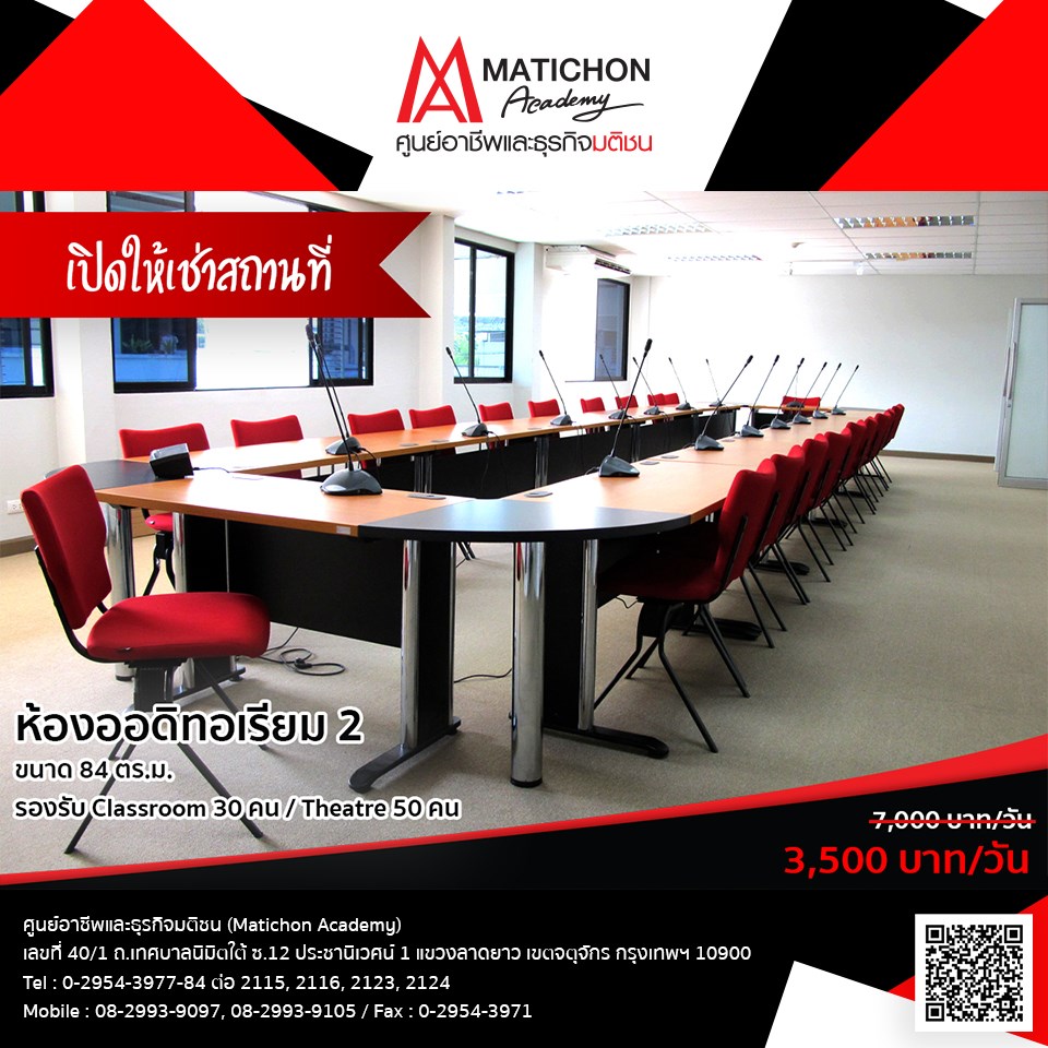 ห้องออดิทอเรียม2 ขนาด84 ตร.ม. รองรับ Classroom30คน/Theatre50คน ราคา 7,000 บาท/วัน เหลือ3,500 บาท/วัน