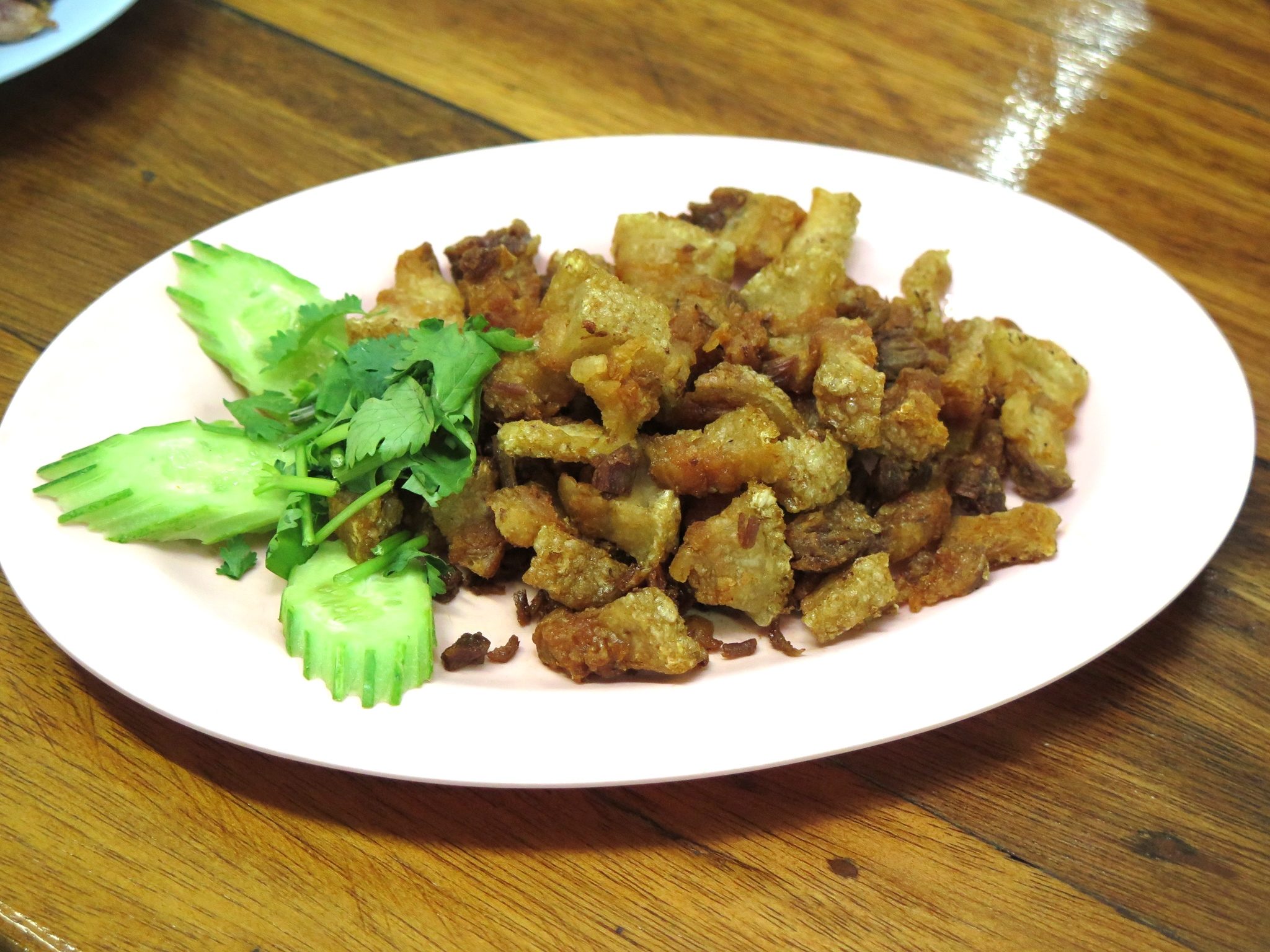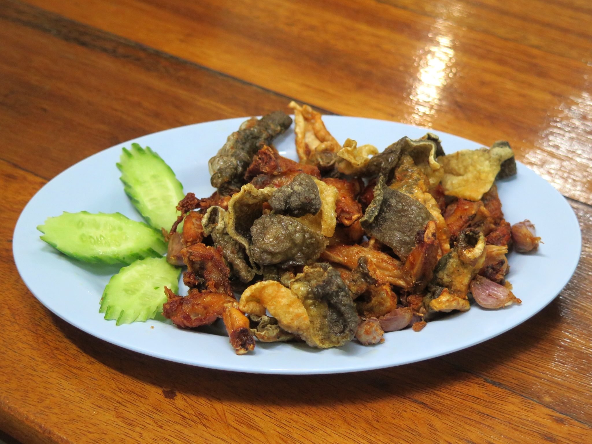มาคราวนี้ได้ชิมเมนูเด็ดที่ยกให้เป็นที่สุดในดวงใจไปแล้ว นั่นก็คือ หมูกรอบคั่ว (120 บาท) ที่นำมาต้มแล้วผึ่งให้แห้ง ทอดเก็บไว้ พอใครสั่งนำมาคั่วกับซีอิ๊วท้องถิ่นตรากวางและซอสปรุงรส กรอบฟูหอมอร่อยสุดยอด ห้ามพลาดเลยเป็นอันขาด
