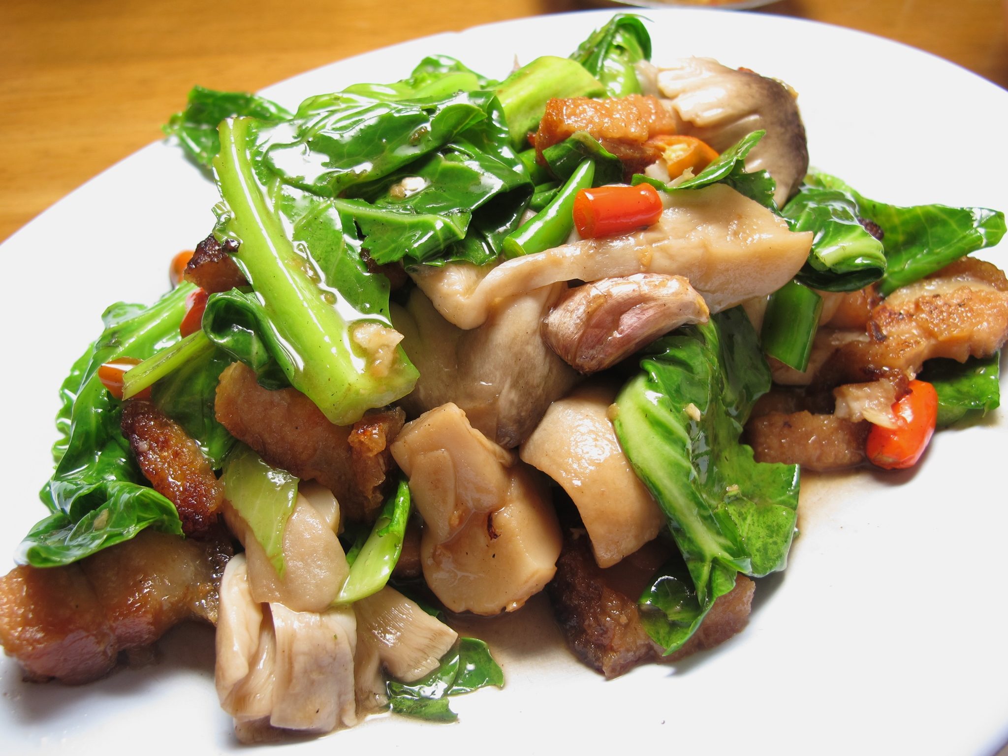 ปิดท้ายด้วย ผัดแขนงคะน้าหมูกรอบ ใส่พริกใส่เห็ด (80 บาท) มาอีกจาน อร่อยอีกแล้ว ไม่เห็นมีจานไหนไม่อร่อยเลย