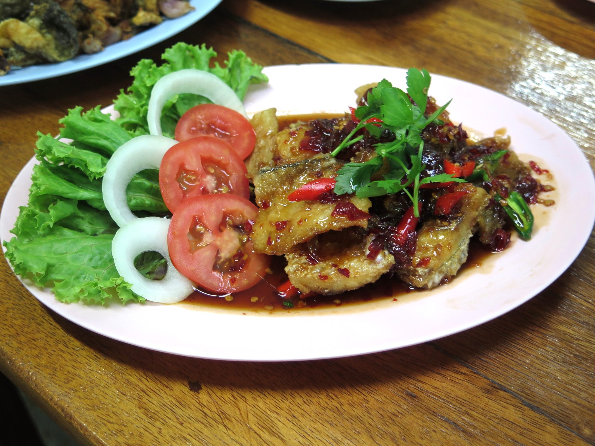 เมนูพื้นบ้านอีกอย่างคือ กบทอดกระเทียม (120 บาท) ที่ทอดมาจนกรอบ ต้องบอกว่ากรอบจริงๆ กินได้ทั้งตัว มีหนังกบทอดซึ่งกรอบพอๆ กับหนังปลาเลย ทอดมาร้อนๆ ไม่อมน้ำมัน มีรสมีชาติ