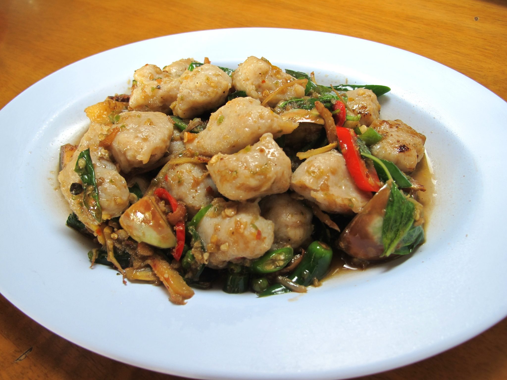 อย่าลืมสั่ง ลูกชิ้นปลากรายผัดขี้เมา (140 บาท) ใส่พริกมาแบบไม่ยั้ง ถึงเครื่องเผ็ดร้อน ลูกชิ้นปลากรายตีเองนวดเอง นำไปทำ แกงเขียวหวาน แกงป่า หรือลวกจิ้มก็ได้