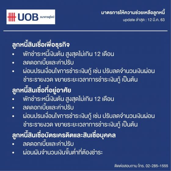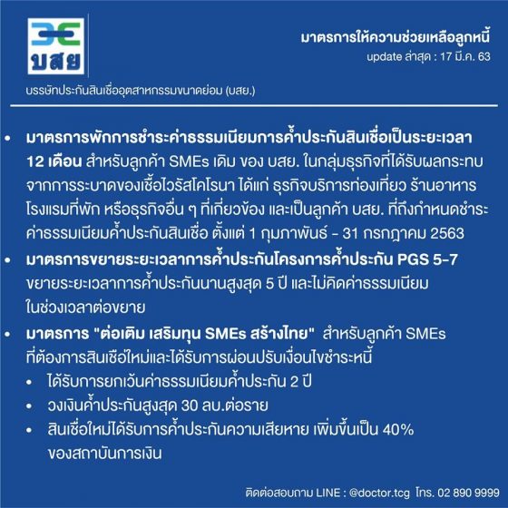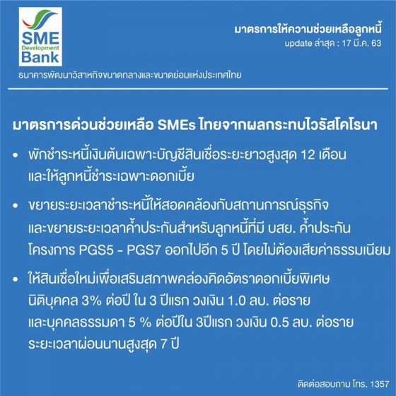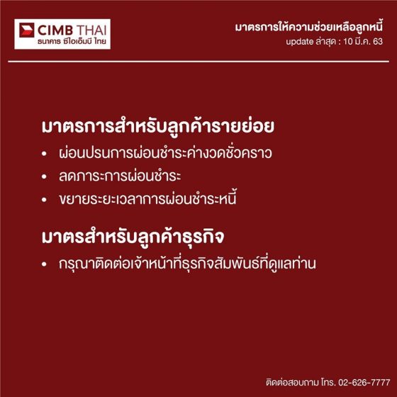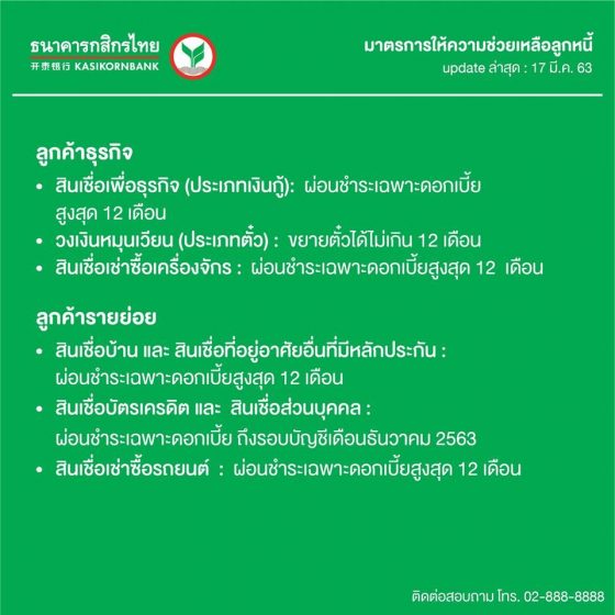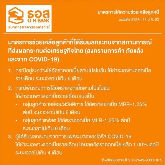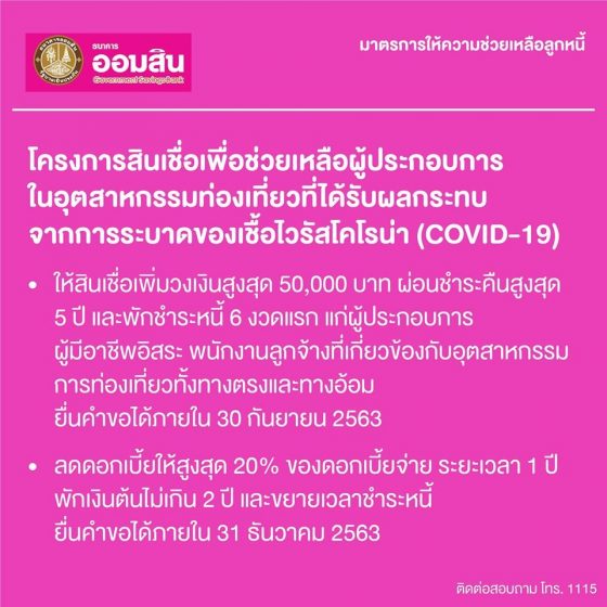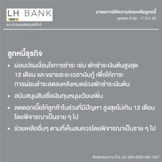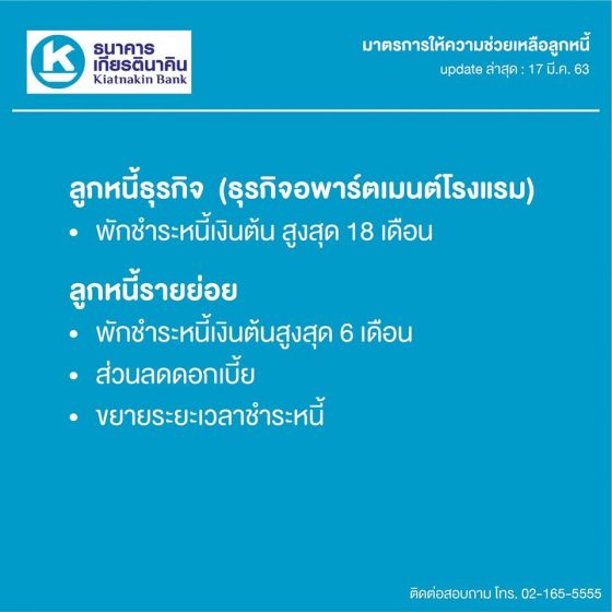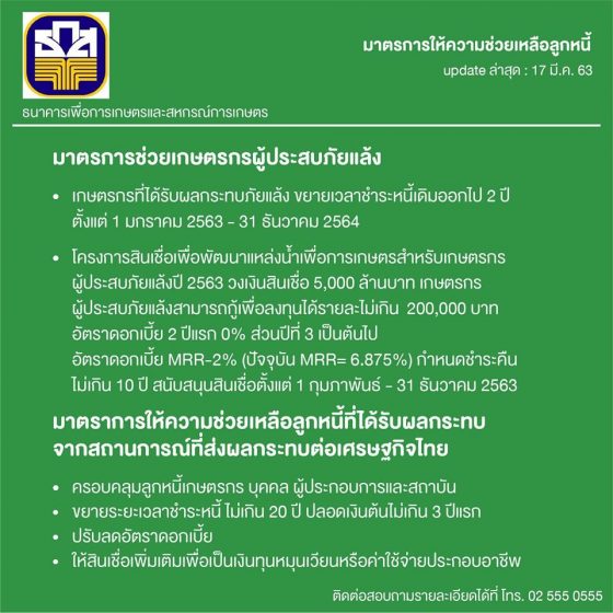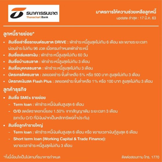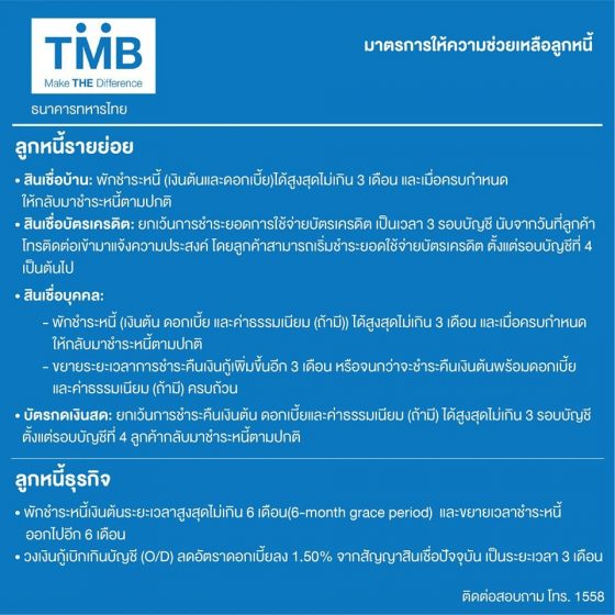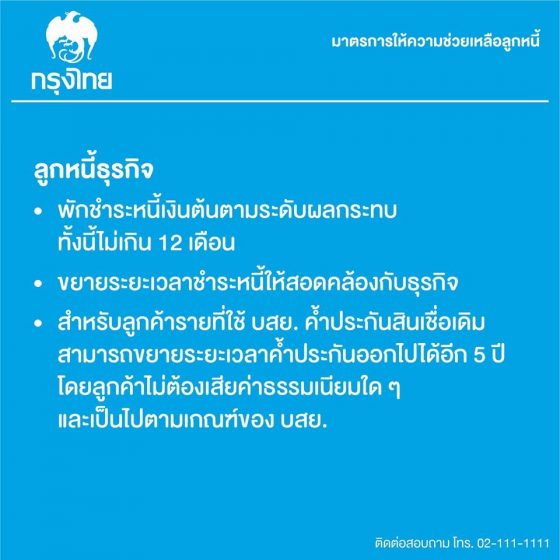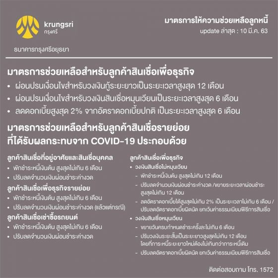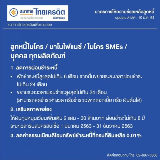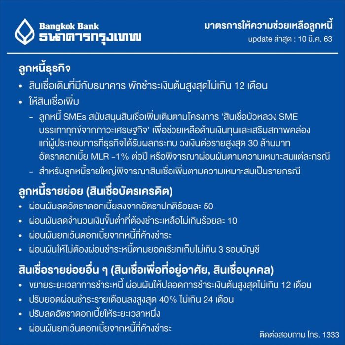 เช็กมาตรการช่วยลูกหนี้ทุกสถาบันการเงิน ช่วงวิกฤตโควิด-19 ที่นี่!! Money เงินทองต้องรู้ FacebookFacebookXTwitterLINELine อัพเดต! มาตรการช่วยลูกหนี้ของทุกสถาบันการเงิน สู้วิกฤตโควิด-19จากการแพร่ระบาดของเชื้อไวรัสโควิด-19 ในหลายประเทศทั่วโลก ได้สร้างผลกระทบเป็นวงกว้าง หลายธุรกิจได้รับผลกระทบอย่างหนัก โดยธนาคารแห่งประเทศไทย ได้สรุปมาตรการให้ความช่วยเหลือลูกหนี้ของแต่ละสถาบันการเงินที่ได้รับผลกระทบจากสถานการณ์ที่ส่งผลกระทบต่อเศรษฐกิจไทย เช่น ภัยแล้ง และการระบาดของเชื้อไวรัสโควิด-19 ไว้ดังนี้ FacebookFacebookXTwitterLINELine