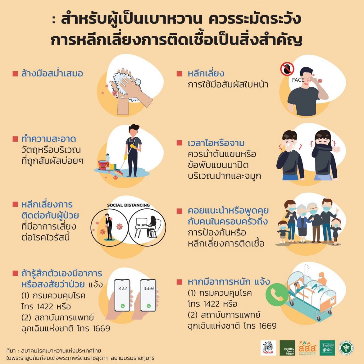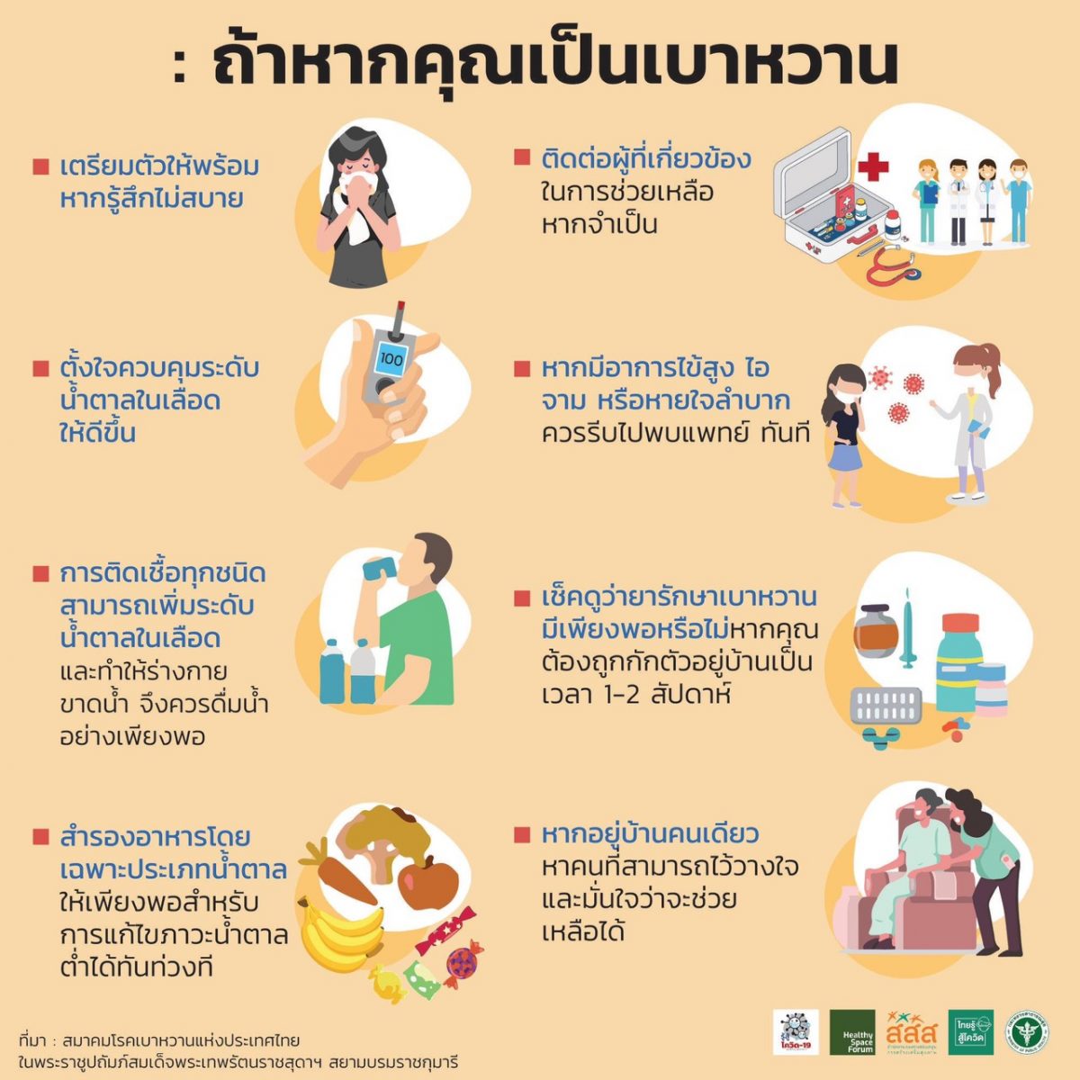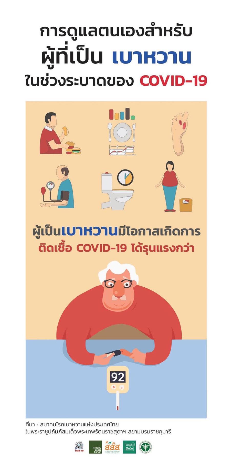 ภาพและข้อมูลจาก : สมาคมโรคเบาหวานแห่งประเทศไทย ในพระราชูปถัมภ์สมเด็จพระเทพรัตนราชสุดาฯ สยามบรมราชกุมารี , เพจรู้สู้ COVID-19