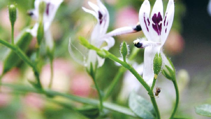 ดอกออกเป็นช่อที่ซอกใบบริเวณปลายยอด กลีบดอกสีขาว ยาว 0.9-1.5 ซ.ม. ส่วนฐานเชื่อมกันเป็นรูปกรวย ยาว 4-8 ม.ม. ปลายแยกเป็นแฉก ผลแบบแห้งแตก รูปทรงรี กว้าง 0.3-0.4 ซ.ม. ยาว 1.5-2.0 ซ.ม.