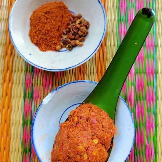 เช่นเดียวกับพริกแกงเผ็ด ถ้ามีที่ชอบอยู่แล้ว ก็ตักควักมาได้เลย แต่ถ้าคิดว่ายังอ่อนรสอ่อนกลิ่นอะไร เช่น อ่อนกระเทียม กะปิ ตะไคร้ ก็ตำเพิ่มเข้าไป สำหรับครกนี้ ผมอยากได้สีแดงเพิ่มให้สีสดๆ จัดๆ กับอยากได้รสเผ็ดร้อนแนวผัดสกุลจีนยูนนาน เลยเพิ่มพริกผงที่ซื้อจากตลาดพม่าย่านบางบอน ธนบุรี กับตำเม็ดฮั่วเจียแดง (พริกหอมจีนแบบหนึ่ง) จากตลาดเมืองเชียงรุ่ง ผสมในพริกแกงด้วยหน่อยหนึ่ง คราวนี้เป็นได้ฉุนร้อนสะใจแน่ๆ