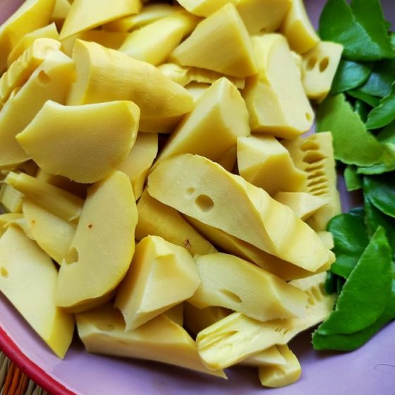 หาหน่อไม้ต้มมาหั่นชิ้นแฉลบๆ ส่วนใหญ่หน่อต้มจะรสจืดมาแล้วนะครับ แต่ลองชิมดูหน่อย ถ้าขมปร่าไป ก็ต้มทิ้งน้ำสักครั้งหนึ่งก่อน