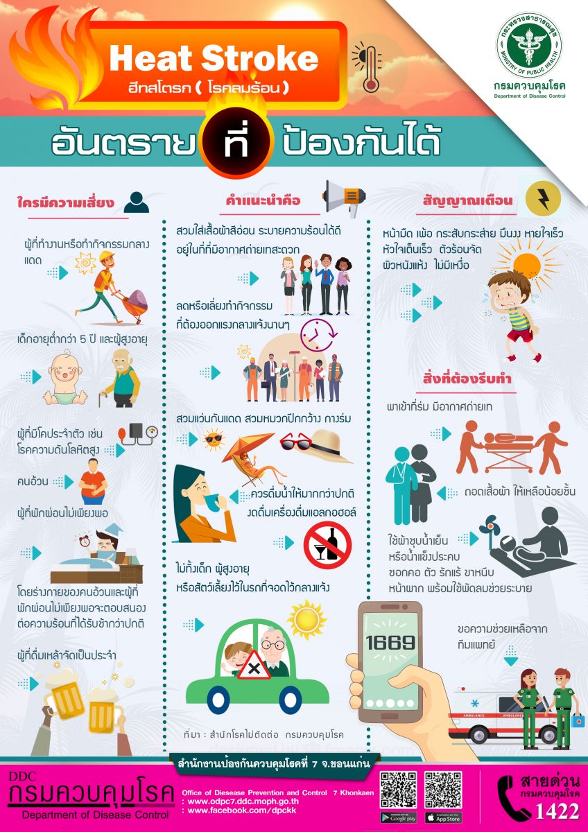 นายแพทย์สุขุม กาญจนพิมาย ปลัดกระทรวงสาธารณสุข ให้สัมภาษณ์ว่า ในช่วงสัปดาห์นี้ ประเทศไทยจะมีสภาพอากาศที่ร้อนถึงร้อนจัด อุณหภูมิตั้งแต่ 36-41 องศาเซลเซียส บางจังหวัดทางภาคตะวันออกเฉียงเหนืออุณหภูมิสูงถึง 42 องศาเซลเซียส จึงขอให้ประชาชนระวังการเจ็บป่วยที่เกิดขึ้นตั้งแต่มีอาการเพียงเล็กน้อย ไปจนถึงอาการรุนแรงที่อาจเสียชีวิต ได้แก่ เพลียแดด โรคลมร้อนหรือฮีทสโตรก (Heat Stroke) เกิดจากการทำกิจกรรมหรือทำงานในที่อากาศร้อนจัดเป็นเวลานาน จนร่างกายไม่สามารถปรับตัวและควบคุมความร้อนในร่างกาย ส่งผลให้อวัยวะต่างๆ ทำงานล้มเหลว โดยเฉพาะกลุ่มเสี่ยง ได้แก่ ผู้ที่มีอาชีพทำงานหรือทำกิจกรรมกลางแดด เช่น กรรมกร ก่อสร้าง เกษตรกร กลุ่มเด็กอายุต่ำกว่า 5 ปีและผู้สูงอายุ ผู้ที่มีโรคประจำตัว เช่น โรคหัวใจ โรคหลอดเลือดสมอง โรคความดันโลหิตสูง คนอ้วน ผู้ที่พักผ่อนไม่เพียงพอ และผู้ที่ดื่มเครื่องดื่มแอลกอฮอล์