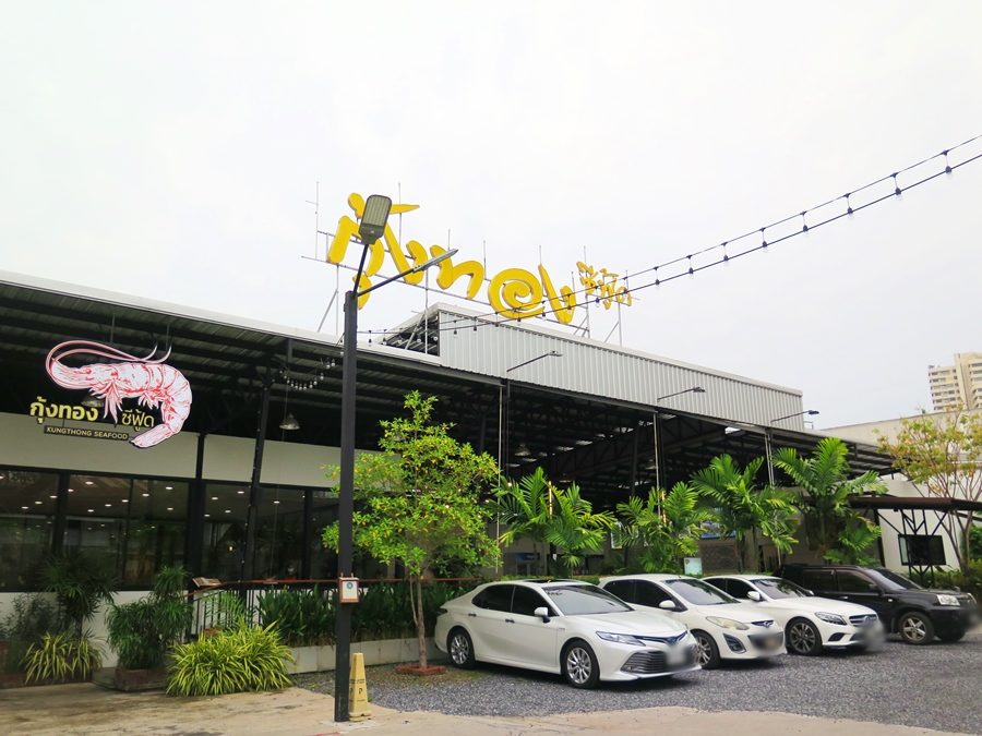 แต่เมื่อเลี้ยวเข้าไปแล้วก็จะเห็นลานจอดรถกว้างขวางจุได้ประมาณ 25 คัน ตัวร้านติดไฟสว่างไสวชั้นเดียวเพดานสูง มีทั้งห้องปรับอากาศจุคนได้ 80 คน และโซนด้านนอกอีก 80 คน แปลกแต่จริงป้ายไฟชื่อร้านกุ้งทองซีฟู้ดที่ผนังด้านในกลับเด่นชัดกว่าด้านหน้าเป็นกอง