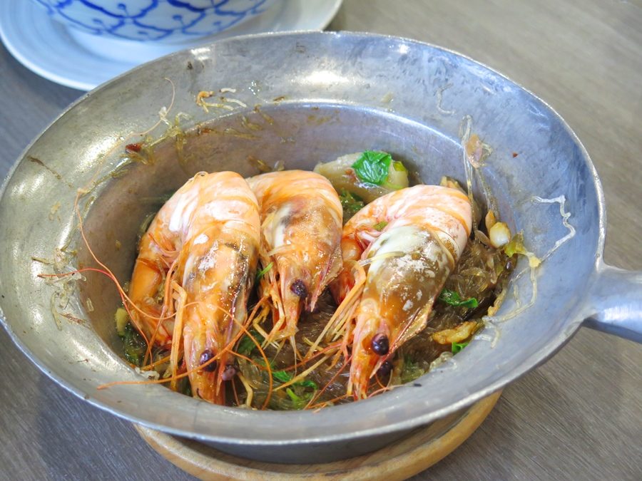 ที่ห้ามพลาดอร่อยไม่ซ้ำใครคือ กะเพรากุ้งแชบ๊วยอบวุ้นเส้น (295 บาท + 10% คือค่าบริการ 3% และภาษีมูลค่าเพิ่ม 7%) ให้กุ้งอบวุ้นเส้นใส่กุ้งแชบ๊วยตัวใหญ่ๆ 3 ตัว รับจากเรือประมงเล็กที่ระนองและภาคตะวันออก ราดด้วยซอสกะเพราเข้มหอมจากครัวกลางที่มหาชัย