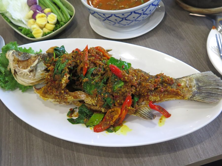 ซึ่งพวกเราชอบกินรสจัดๆ หอมๆ เลยสั่ง ปลากะพงทอดราดพริกสูตรโบราณ (ตัวละ 1 กิโลกรัม 550 บาท+) ใส่เครื่องแกงตำเองสดๆ หลังร้าน ผสมพริกแกงภาคกลางกับพริกแกงใต้ใส่ขมิ้น จะเปลี่ยนเป็น ปลาเนื้ออ่อนราดพริกสูตรโบราณ (ขีดละ 150 บาท+ มีหลายขนาดตั้งแต่ครึ่งกิโลกรัมจนถึง 1 กิโลกรัม) หรือ ปลาเก๋าดำราดพริกสูตรโบราณ (ตัวละ 1 กิโลกรัม 860 บาท+) ก็ได้