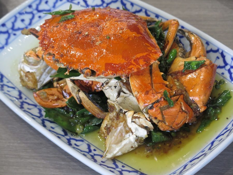 กินกุ้งก็ต้องกินปูด้วย เมนูห้ามพลาดคือ ปูเนื้อผัดพริกขี้หนู (ราคาตามขนาดปู มีตารางราคาให้ดู ตัวนี้หนัก 8 ขีด 1,760 บาท+) ปูทองหลางของดีจากสมุทรปราการและสุราษฎร์ธานี ผัดกับซอสพริกขี้หนูสูตรเด็ดจากครัวกลาง ใส่พริกไทยอ่อน ใบมะกรูด พริกขี้หนูสวน ปรุงด้วยน้ำปลาผสมน้ำตาล หอมอร่อยเป็นที่สุด ส่วนถ้าใครชอบเอาน้ำซอสมาคลุกข้าวให้สั่ง ปูเนื้อผัดพริกต้นหอม (ราคาตามขนาดปูเช่นกัน) ซึ่งใส่พริกขี้หนูสวนเช่นกัน