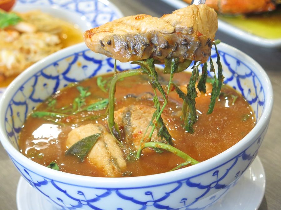 ต่อด้วยเมนูภาคกลาง แกงส้มปลากะพงทอดโบราณ หรือจะเป็น แกงส้มปลาสลิดทอดโบราณ (290 บาท+ทั้ง 2 เมนู) ใส่ได้ทั้งผักกระเฉดหรือผักรวม จะสั่งให้แยกปลาสลิดทอดมาต่างหากได้เช่นกัน