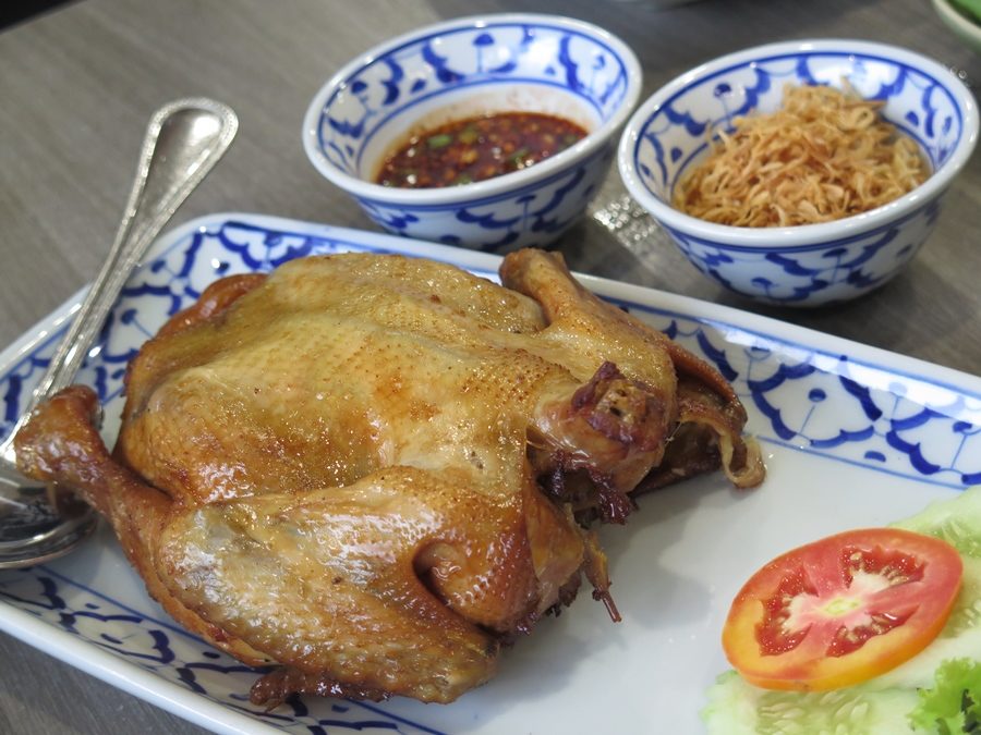 ขอแนะนำเมนูใหม่สดๆ ร้อนๆ ที่ไม่ใช่อาหารทะเล แต่เป็น ไก่บ้านลืมเหนียว (ตัวละ 345 บาท+) ที่ยกมือเชียร์ให้สั่งเพราะเนื้อนุ่มชุ่มฉ่ำมาก ใช้ไก่บ้านจากเชียงใหม่ตัวย่อมๆ ไม่เกิน 1 กิโล นำมาอบน้ำผึ้ง 5 ชั่วโมงจนนุ่มหอม ด้วยกรรมวิธีเลียนแบบไก่ขอทาน แต่เปลี่ยนเป็นห่อด้วยกระดาษไข่และฟอยล์แทน จิ้มด้วยน้ำจิ้มแจ่วใส่หอมเจียว