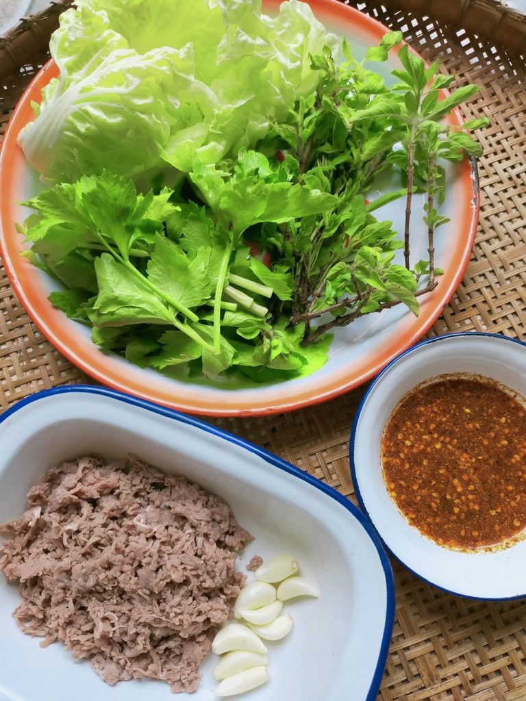 เห่าดงจานแรกที่ผมรู้จักนี้ เป็นเนื้อวัวหั่นชิ้นบาง ลวกพอสุก ราดน้ำปรุงรสจัดที่มีน้ำปลา น้ำมะนาว พริกแห้งป่นผสมมาแบบชุ่มๆ เคียงข้างขอบจานด้วยผักสดกรอบล้างสะอาดสะอ้านสามอย่าง ได้แก่ผักกาดขาว คื่นช่าย และใบกะเพราสด
