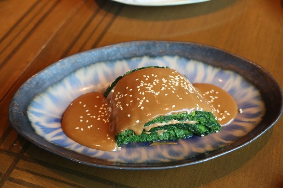 การสั่งอาหารเริ่มจากเมนูเรียกน้ำย่อยจานขนาดย่อมกำลังดี มีเมนู ผักโขม (Spinach Leaves) (260 ++) ทำจากผักโขมราดซอสงาผสมน้ำส้มสายชูที่หมักจากข้าว มีส่วนผสมของถั่วลิสงคั่ว รสชาติคล้ายเนยถั่วหอมๆ ครีมๆ และมีรสอมเปรี้ยวเล็กน้อย เมนูนี้มาจากภาคเหนือที่กรุงปักกิ่ง