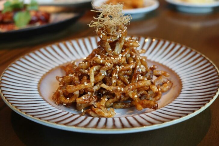 ต่อด้วย ปลากะพงกรอบ (Crispy Seabass)(380++) เมนูจากมณฑลส่านซี (Shaanxi) ทางตะวันตกเฉียงเหนือของจีน เชฟบอกว่าเป็นจานโปรดของสนมเอกหยางกุ้ยเฟย ทำจากปลากะพงขาวเป็นเส้นยาวเล็กๆ กรอบหนึบเคลือบซอสรสเปรี้ยวอมหวาน