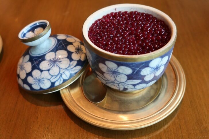 ของหวานหนานเป่ยนั้นอลังการมาก มีขนมสไตล์ฝรั่งตะวันตกใช้ชื่อว่า คาเวียร์ (Caviar)(290++) ใส่ในถ้วยกระเบื้องเคลือบลายดอกสีฟ้าขาวสวยงามมาก ชั้นบนเป็นเจลลีเม็ดกลมๆ ทำจากบลูเบอร์รี ชั้นกลางเป็นช็อกโกแลตกานาช ส่วนชั้นล่างเป็นคุกกี้ซาเบล่ (Sablé) นุ่มๆ รสช็อกโกแลตซีซอลต์เค็มนิดๆ เป็นฝีมือของเชฟฟลอเรียน ชาวฝรั่งเศส
