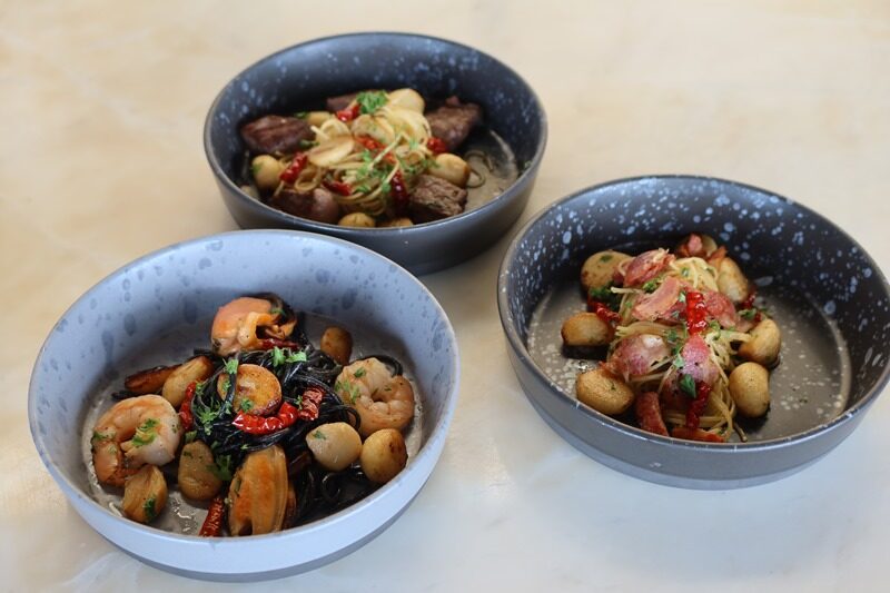 ข้างๆ มีมุมพาสต้าที่สุดยอดมาก มีหลากหลายทั้งสปาเกตตีพริกกระเทียมเนื้อวากิว สปาเกตตีคาโบนาราครีมๆ สปาเกตตีหอยลายวองโกเล่ สปาเกตตีซอสแกะรากูต์ สปาเกตตีพริกกระเทียมเบคอนใส่ไวน์ขาว สปาเกตตีเส้นดำซีฟู้ด และชีสวีลพาสต้า เส้นแองเจิลแฮร์คลุกในอ่างชีสยักษ์ถูกใจคนรักชีส ของดีอีกอย่างคือข้าวกะเพราเนื้อวากิวไข่ออนเซน