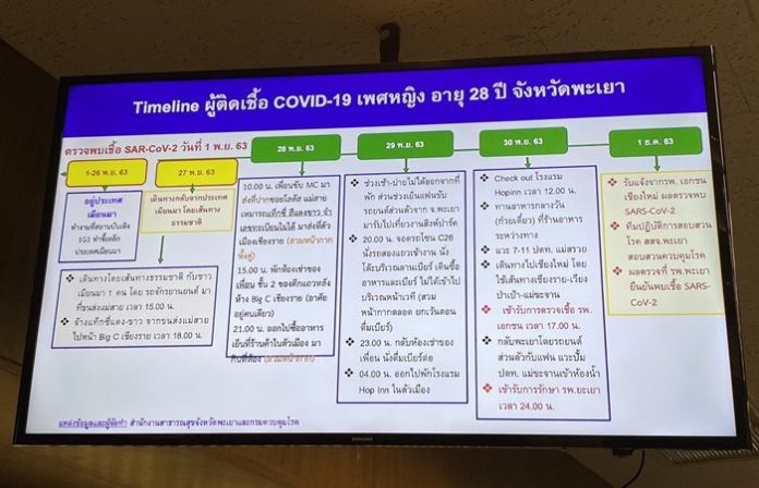 จากนั้น 04.00 ออกไปพักโรงแรม Hop Inn ในตัวเมือง วันที่ 30 พ.ย. ทานอาหารกลางวันระหว่างทาง แวะปั๊ม ปตท. แม่สรวย เดินทางไปเชียงใหม่ เข้าตรวจเชื้อ รพ.เอกชน เวลา 17.00 น. กลับพะเยา โดยรถยนต์ส่วนตัว เข้ารับการรักษาใน รพ.พะเยา 24.00 น. ได้รับแจ้งว่าติดเชื้อ