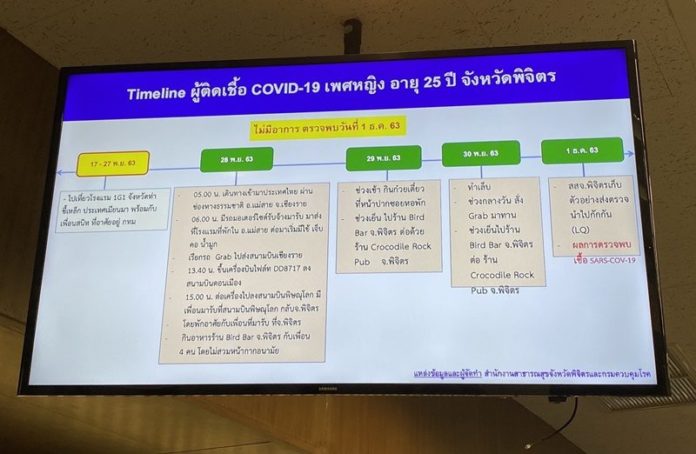 จากนั้น ไปกินอาหารกับเพื่อน 4 คน ที่ร้าน Bird Bar วันที่ 29 พ.ย. กินก๋วยเตี๋ยวหน้าหอพัก ช่วงเย็นไป ร้าน Bird Bar ต่อด้วยร้าน Crocodile Rock Pub จ.พิจิตร วันที่ 30 พ.ย. ทำเล็บ ช่วงกลางวันสั่งแกร็บ ช่วงเย็น ไป ร้าน Bird Bar ต่อด้วยร้าน Crocodile Rock Pub วันที่ 1 ธ.ค. สสจ.พิจิตร เก็บตัวอย่างตรวจ พบเชื้อโควิด