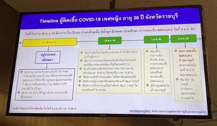 หญิงอายุ 36 ปี อยู่ประเทศพม่า วันที่ 3-28 พ.ย. ไปเที่ยว 1G1 2 คืน ที่ ท่าขี้เหล็ก วันที่ 26 พ.ย. มีไข้ น้ำมูก เจ็บคอ ปวดกล้ามเนื้อ ซื้อยากินเอง วันที่ 29 พ.ย. เดินทางกลับไทยช่องทางธรรมชาติ เข้าเชียงใหม่ พร้อมเพื่อน ไม่สวมหน้ากาก นั่งเครื่องบิน Thai Lion Air เที่ยวบิน 10.40 น. ถึงดอนเมือง เวลา 12.00 น. ขึ้นแท็กซี่ จากดอนเมือง ไปที่หมอชิต ใช้บริการรถตู้ จากหมอชิต ลงที่ Big C ราชบุรี ใช้บริการจักรยานยนต์ จากบิ๊กซี ไป รพ.เอกชน วันที่ 1 ธ.ค. เพื่อนที่ไปงานเลี้ยงด้วยกัน ส่งผลตรวจพบเชื้อโควิด หญิงวัย 36 ปี ถูกส่งตัวต่อไป รพ.ราชบุรี ผลตรวจพบเชื้อ